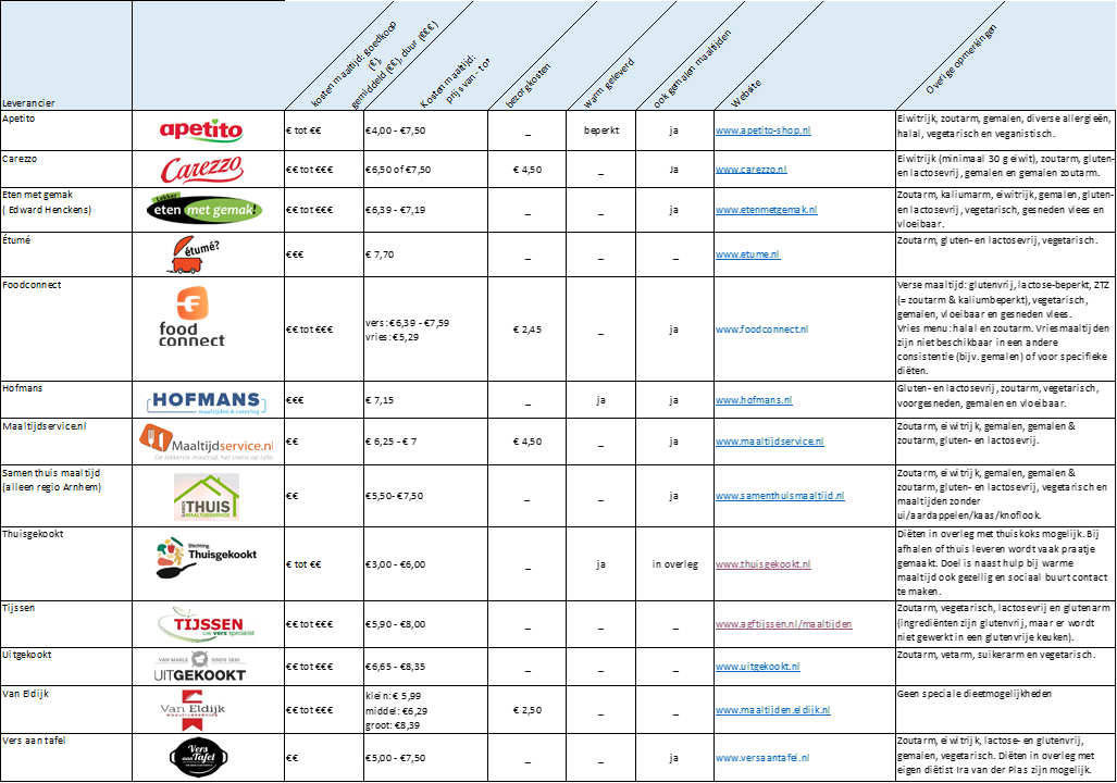 Hierdoor kan het zijn dat het (even) niet meer lukt om zelf gezonde warme maaltijden te bereiden. Gelukkig zijn er verschillende maaltijdservice bedrijven die warme maaltijden aan huis bezorgen. Soms kant-en-klaar en warm, zodat u gelijk kunt gaan eten. Een andere mogelijkheid zijn koelverse of diepvries maaltijden, die u alleen nog maar in de magnetron hoeft te verwarmen.